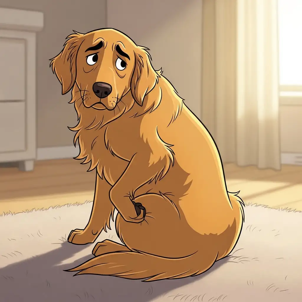 강아지 고관절 이형성증으로 인해 뒷다리 통증을 느끼며 불편해하는 대형견의 모습