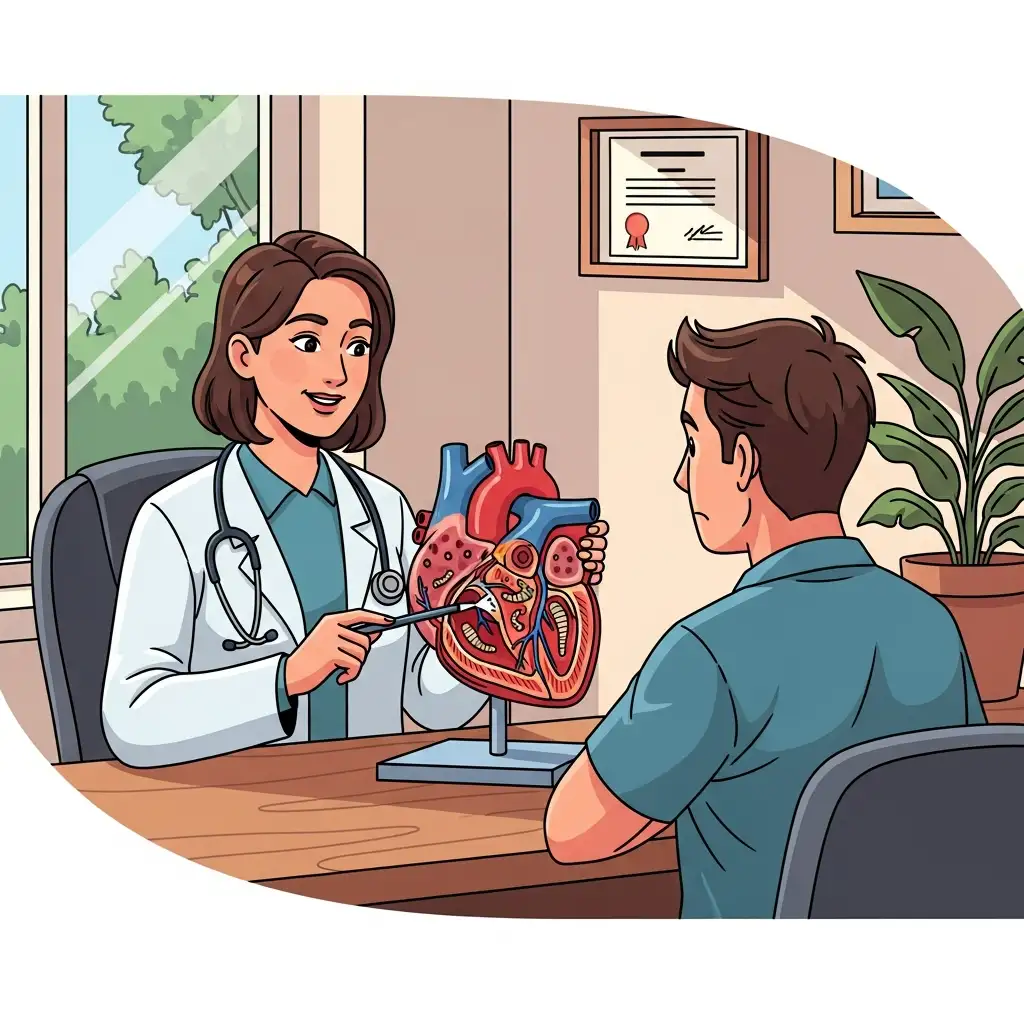 동물병원에서 수의사가 보호자에게 강아지 심장사상충의 위험성과 예방의 중요성을 설명하는 모습입니다
