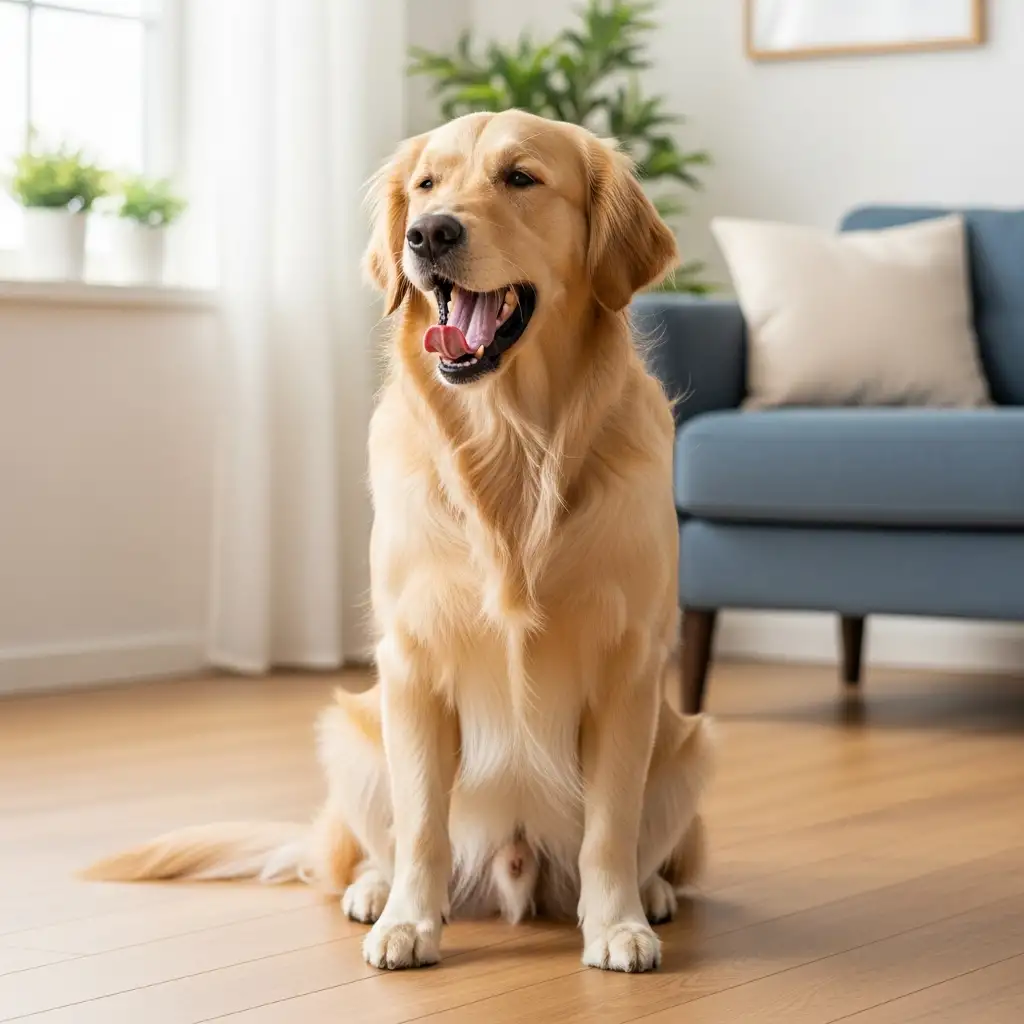 거실 바닥에 앉아 고개를 살짝 돌린 채 하품을 하며 스스로를 진정시키고 있는 골든 리트리버 강아지의 모습으로 대표적인 카밍 시그널 중 하나인 하품하기 행동을 설명함