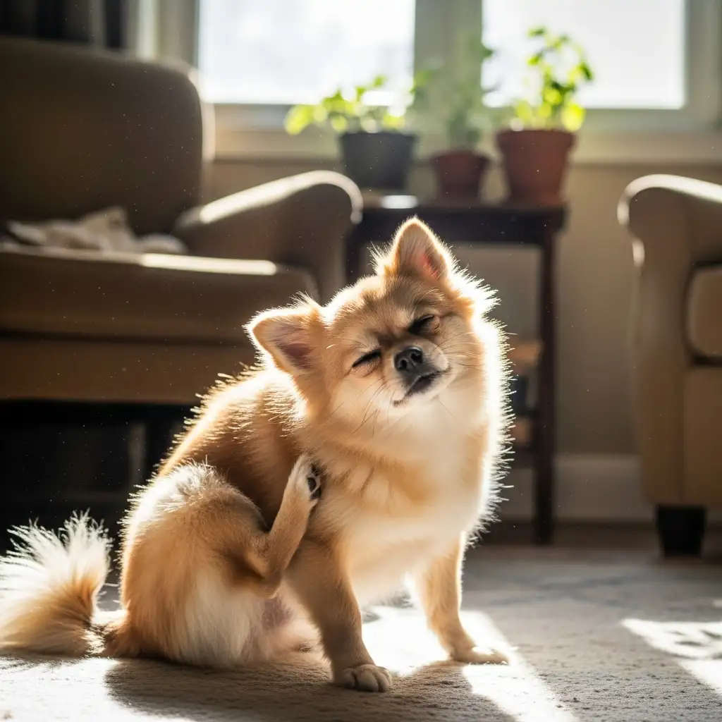 환절기 가려움증으로 인해 뒷발로 목 주변을 긁고 있는 강아지의 모습으로 피부병 증상을 보여줍니다