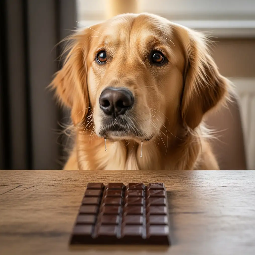 강아지가 식탁 위에 놓인 다크 초콜릿을 호기심 어린 표정으로 바라보고 있는 모습이며 초콜릿 중독의 위험성을 경고합니다